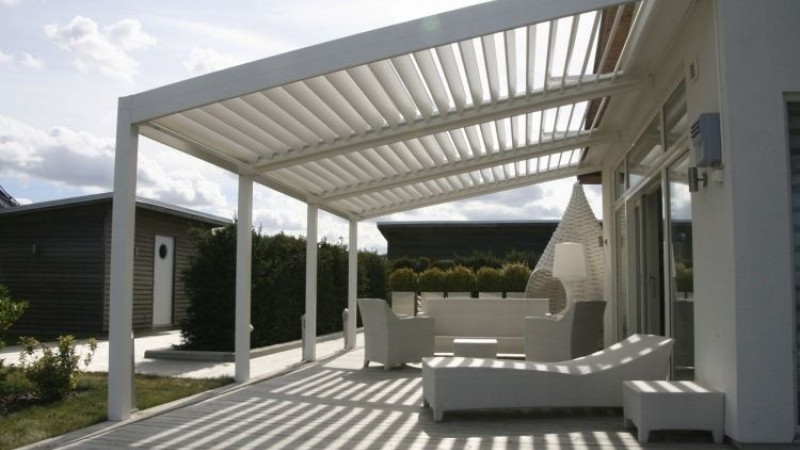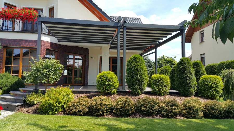 Pergole z dachem zabudowanych z ruchomych paneli aluminiowych (lameli). Dzięki regulacji ustawienia pochyłu kąta paneli, możemy dostosować ilość promieni słonecznych a także całkowicie zamknąć zadaszenie przed słońcem lub deszczem.